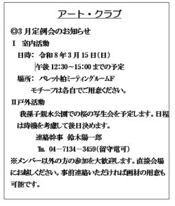 「アート・クラブ」は水彩画を主として、色鉛筆画、デッサン画をはじめ、いろいろな造形美術を愛好する人たちの集まりです。作品のよしあしではなく、皆が集まり、各々に創作活動を楽しんでいます。絵画教室ではないので、講師はいません。活動日は月に2回で、「室内写生」と「戸外写生」を行っています。