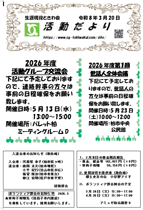 ときわ会は、ボランティア部会が中心となって会員の皆様から提供いただいたアルミ缶を資金化して車椅子を購入し、福祉施設に寄贈する活動を行っていますが、今回、3台目を『流山ケアセンター「そよ風」』様に贈呈しました。贈呈式はコロナ禍で延び延びになっ...